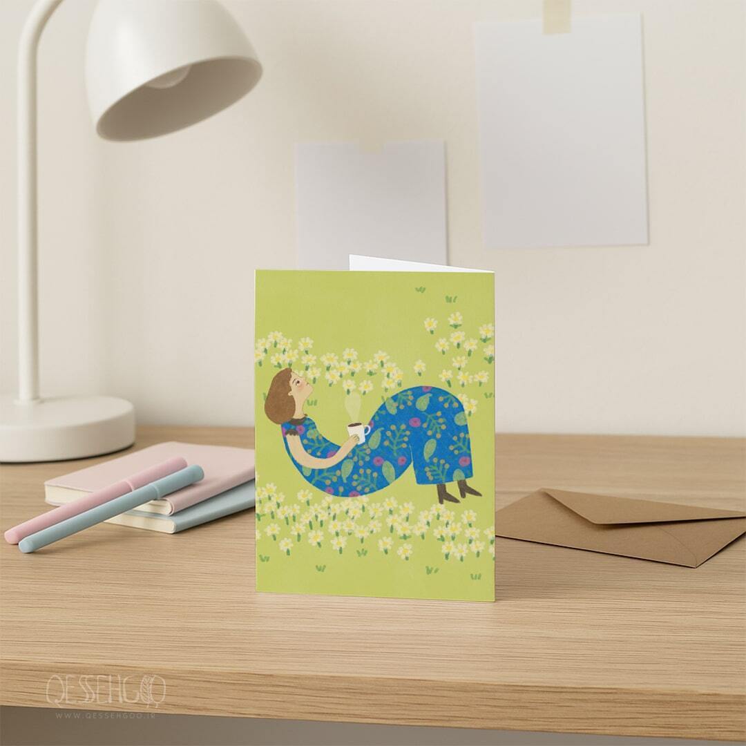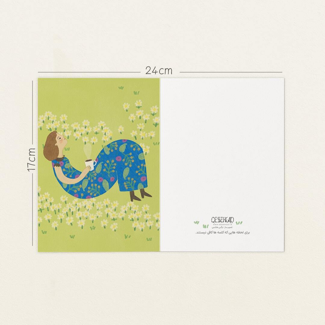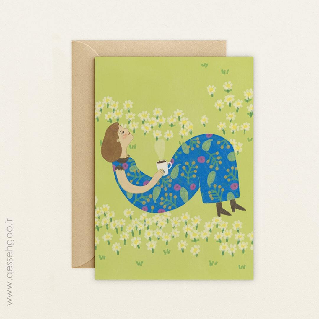 کارت پستال با طرح: دختر در چمنزار با چای
