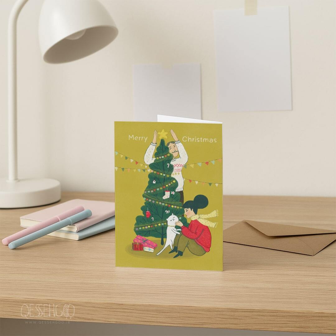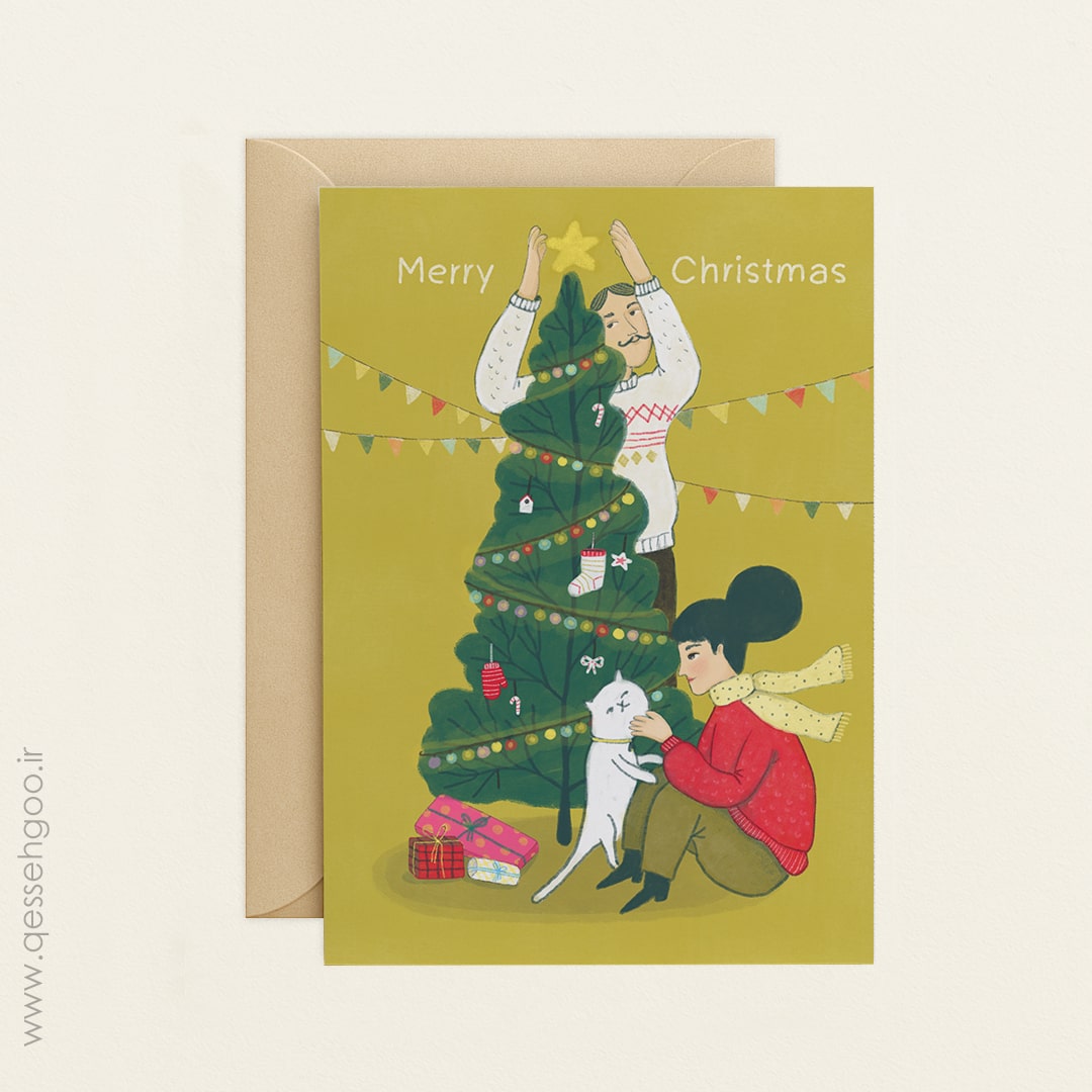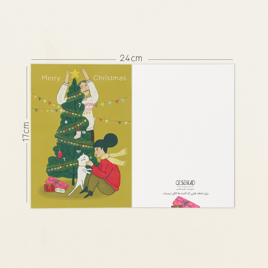 کارت پستال با طرح: مری کریسمس و درخت کاج و هدایا